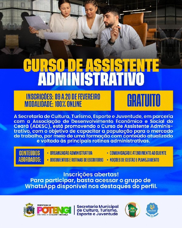 Como parte desse compromisso, está disponível uma nova oportunidade de formação: o Curso de Assistente Administrativo, oferecido de forma totalmente digital e sem qualquer custo para os potengienses. A iniciativa é voltada a pessoas que desejam se preparar melhor para o mercado de trabalho e desenvolver habilidades essenciais para o exercício de atividades administrativas.