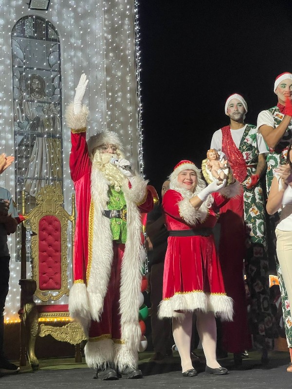 Logo após a abertura, crianças, jovens e famílias participaram de um encantador cortejo conduzido pelo Papai Noel e Mamãe Noel, que seguiram até a Praça da Igreja Matriz. Ao chegar ao local, todos puderam assistir ao acendimento oficial dos enfeites natalinos da praça e da igreja, transformando o centro da cidade em um cenário iluminado, simbólico e repleto de esperança para o município.